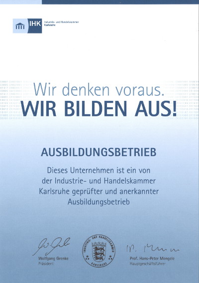 Nachdem SITEMA im Herbst mit der Ausbildung der ersten beiden Jugendlichen zum Industriemechaniker den Ausbildungsbetrieb startet, haben wir nun auch das offizielle Zertifikat von der IHK erhalten (siehe rechts).