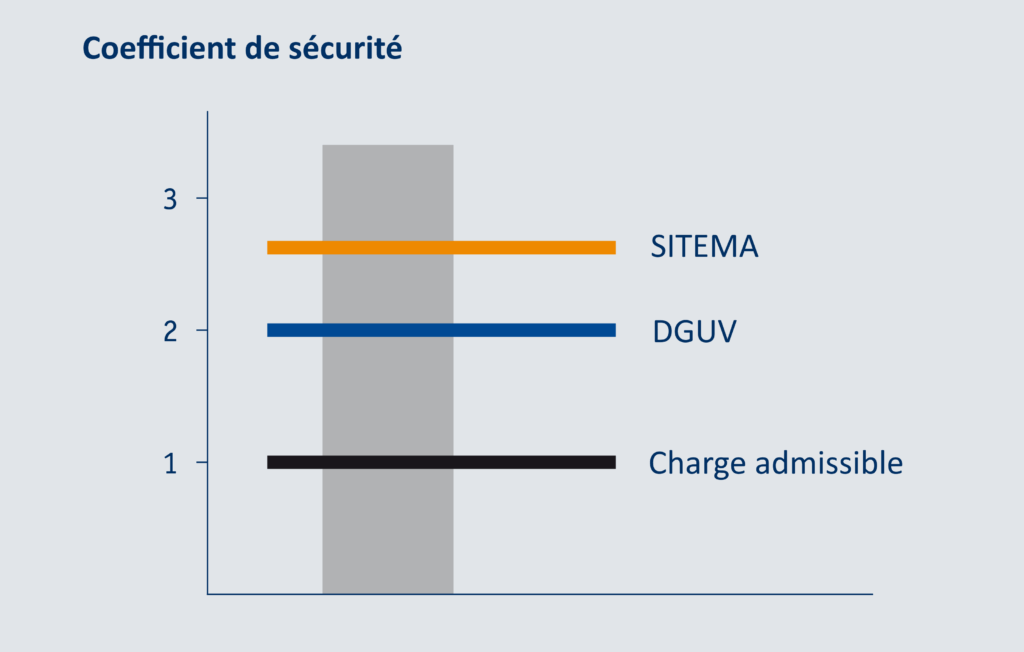 Toutefois, les procédures internes SITEMA imposent même un coefficient de sécurité nettement supérieur. À titre d’exemple, un dispositif antichute PARA type KR40 ou KRP40 avec « SiForce Technology », et dont la charge maximale autorisée est de 3,3 tonnes, offre une force de maintien effective de plus de 10 tonnes !