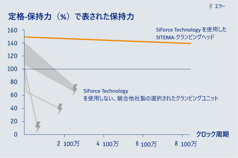 SiForce Technologyを使用した、自己増幅機能を持つクランプでも、ばねは使用されています。しかし、これらのばねのクランプ力は保持力に比べてはるかに小さく、クランピングシステムを確実に正しい位置に置く役割を果たすだけです。 これらのばねは、保持力の発生には関わりません。 このように、クランピングシステムは、純然たる保持ではほぼ負荷がかからなくなり、負荷を移動させる際には重量力に応じた範囲でのみ負荷がかかることになります。 したがって、SiForce Technologyのクランピングヘッドは、この技術を使用しない、ばねで作動するクランプに比べて本質的に長い耐用年数に達します。