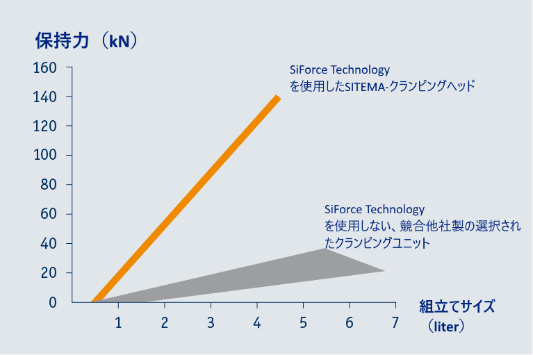 自己増幅機能を持つクランプは、ばねの力を用いる代わりに、下降する質料のエネルギーを利用してこの質料を固定しています。 水平方向で使用する場合には、ドライブ力を用いて締め付けます。 SiForce-クランピングヘッドは、油圧または空圧によって解放保持されます。 クランプを閉じるためには、圧力を喪失するように切り替えられます。