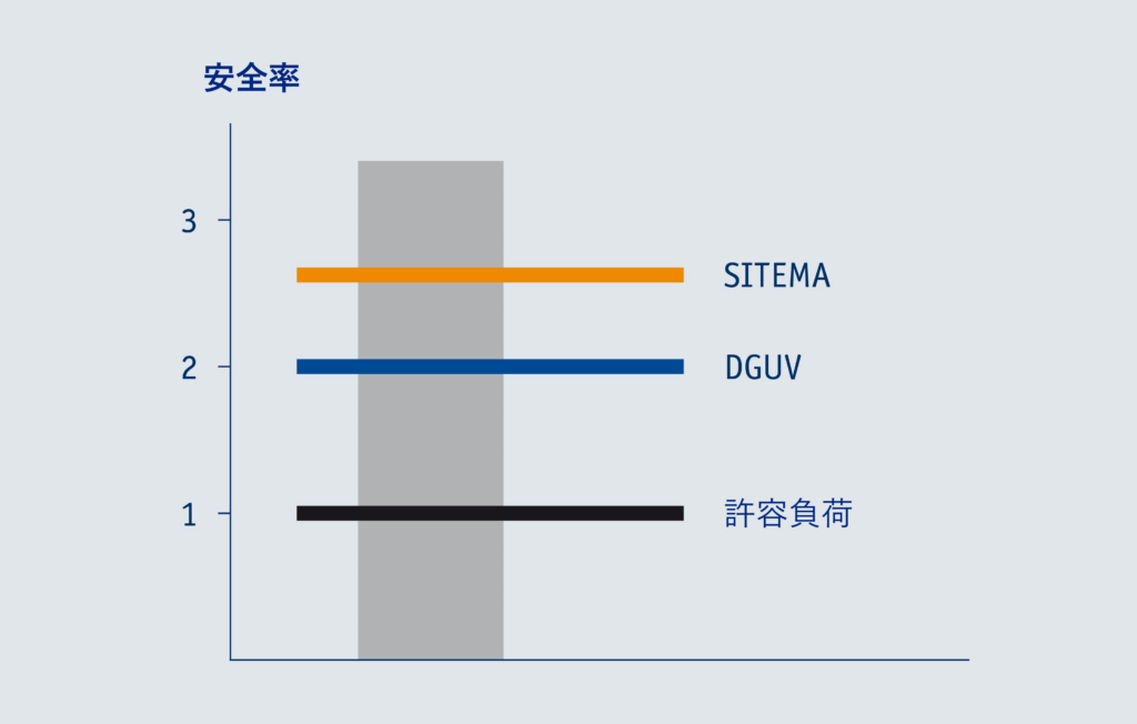 そのうえ、SITEMAの社内基準によれば、それよりも明らかに高い安全率が要求されます。 その結果として、たとえばSiForce Technologyを使用したSITEMA-セーフティーキャッチャーKR 40またはKRP 40は、定格負荷が3.3トンの場合に、実際には10トンを超える保持力を発揮することになります!