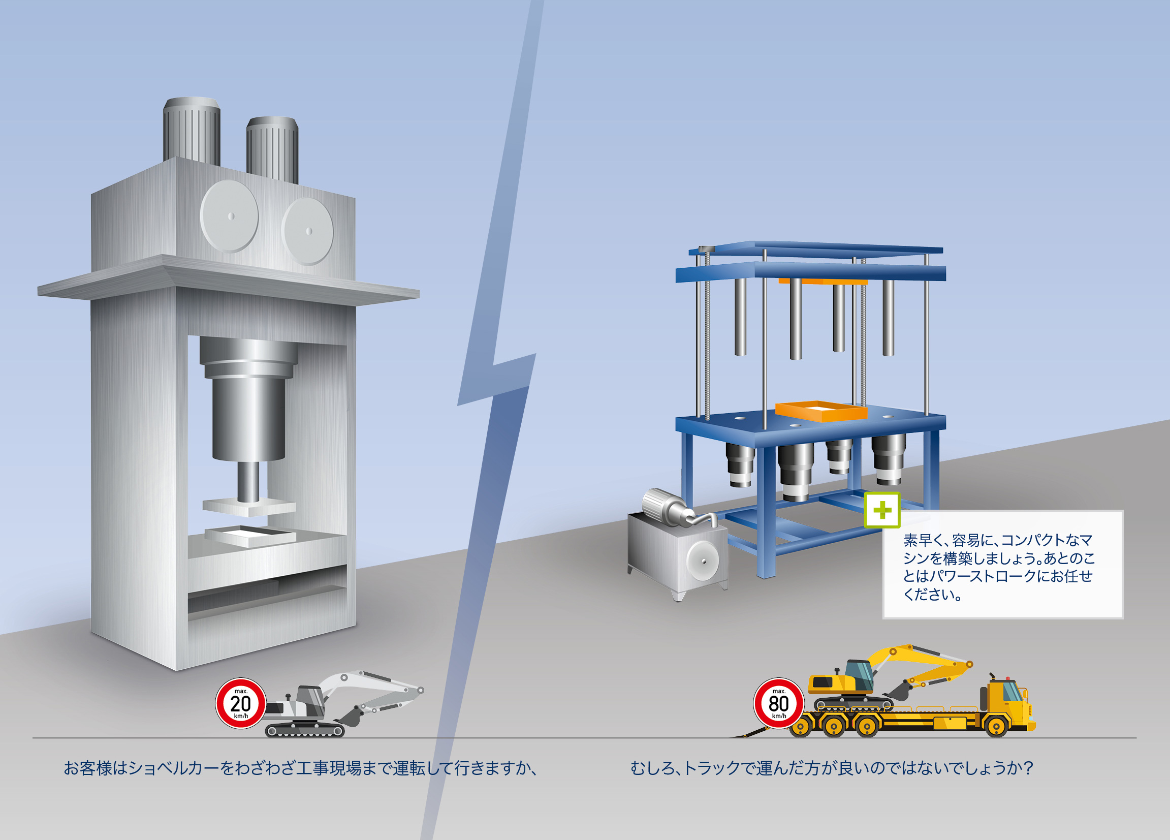 パワーストロークは、この問題をよりスマートに、より良く解決します!パワーストロークは、まずプレスのために短い加圧ストロークが必要とされる所でそれを引き受けます。こうして、型開けストロークおよび型締めストロークは、その目的に合わせて調整済みのスリムな駆動システムによって行われます。素早く、しかもわずかなエネルギーで。インテリジェントに配置されたパワーストロークは、プレスシリンダーのように金型を押すのではなく、引き締めます。こうして、牽引力はマシンフレーム全体に影響を及ぼすことがなくなり、金型そのものにだけ影響を及ぼします。そのため、プレスをよりスリムに構築することが可能になります。さらに、パワーストロークと駆動システムがコンパクトに構築されているため、設計の自由度も高まります。そのうえ、ロッドはパワーストロークから突出することができるため、作業スペースに余裕が生まれます。パワーストロークは効率性が高いため、必要な油圧ユニットの大きさおよびオイル量は大幅に抑えられます。また、消費電力も大幅に削減できます。