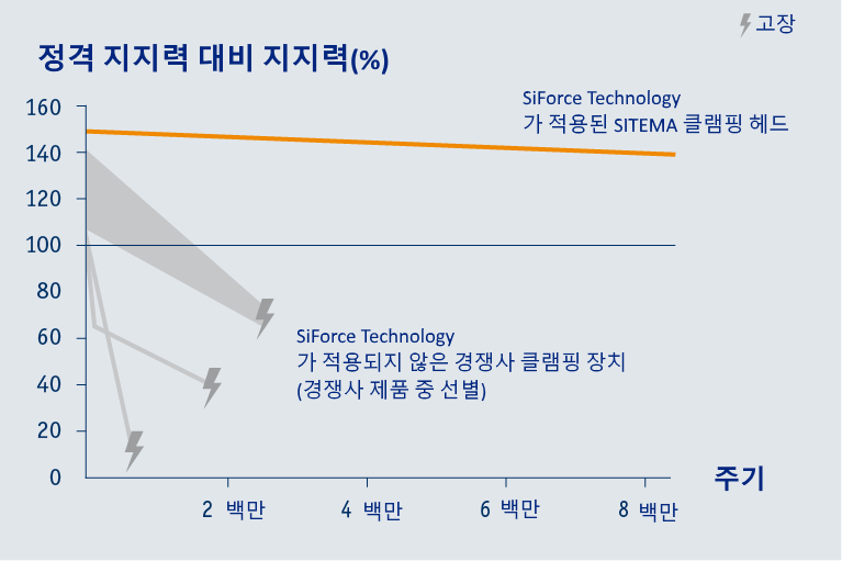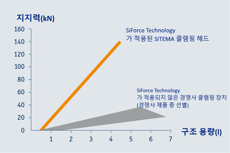 SiForce Technology가 적용되어 자기강화 방식으로 작동하는 클램핑 장치에서도 스프링이 사용됩니다. 하지만 다른 클램핑 장치에서의 지지력과 비교하여 더 약한 힘이 클램핑 시스템이 올바른 위치까지 이동할 정도로만 작용합니다. 즉, 스프링에 의해 지지력이 생성되지는 않습니다. 이에 따라 고정만 할 경우에는 클램핑 시스템에 거의 지지력이 가해지지 않으며, 하중이 가해질 경우에는 중량으로 인해 가해지는 힘에 해당하는 지지력만 가해집니다. 따라서 SiForce Technology가 적용된 클램핑 헤드는 이 기술이 적용되지 않은 스프링 작동 방식의 클램핑 장치보다 더 긴 수명을 갖습니다.