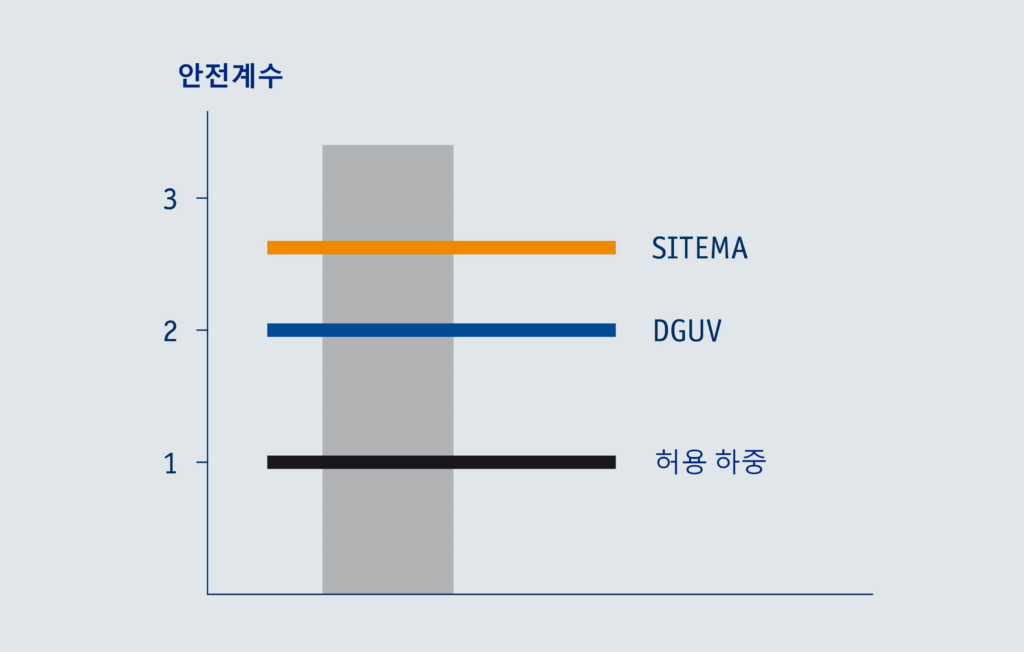 SITEMA 내부 기준에 따르면 더 높은 안전계수가 적용됩니다. 따라서 SiForce Technology가 적용된 SITEMA Safety Catcher KR 40 또는 KRP 40 모델의 경우 정격 하중이 3.3t일 경우 실제 처리 가능한 지지력은 10t을 넘습니다!