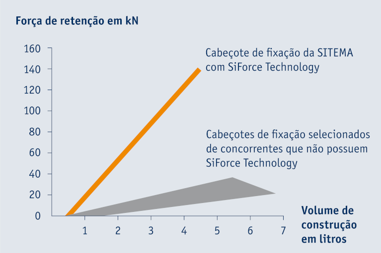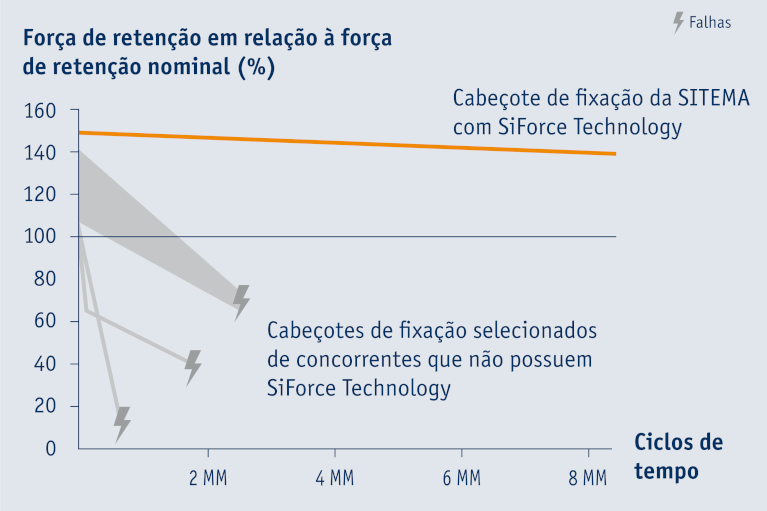 Nas fixações autorreforçadas com SiForce Technology, também são utilizadas molas. No entanto, elas possuem uma força muito menor em comparação com a força de retenção e servem apenas para posicionar corretamente o sistema de fixação de forma segura. Elas não intervêm na geração da força de retenção. Deste modo, o sistema de fixação quase não é carregado quando é simplesmente fixado e, quando a carga é aplicada, ele é carregado apenas com a força do peso. Portanto, os cabeçotes de fixação com SiForce Technology alcançam uma vida útil significativamente mais longa do que as fixações acionadas por mola sem essa tecnologia.