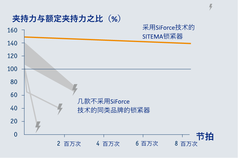 与SiForce技术不同,依靠弹簧操动的锁紧器是通过碟形弹簧或螺旋弹簧将锁紧器挤压在锁紧杆上来制造夹持力的。通过这一途径产生的夹持力取决于弹簧,且不会改变。每一次锁紧器触发,都会产生百分之百的夹持力,因而也会造成百分之百的磨损。