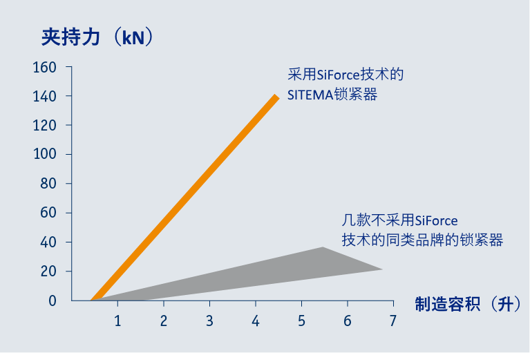 由于不再需要大力的弹簧组,采用SiForce技术的锁紧器体积非常小巧。例如:以大于2的安全系数来锁定6吨的负载,传统的不采用SiForce技术的弹簧锁紧器的直径约为220毫米,长约315毫米。 同样条件下,SiForce锁紧器(例如:SITEMA防坠落锁紧器KR 56)的尺寸要小得多:直径仅为140毫米,长262毫米!