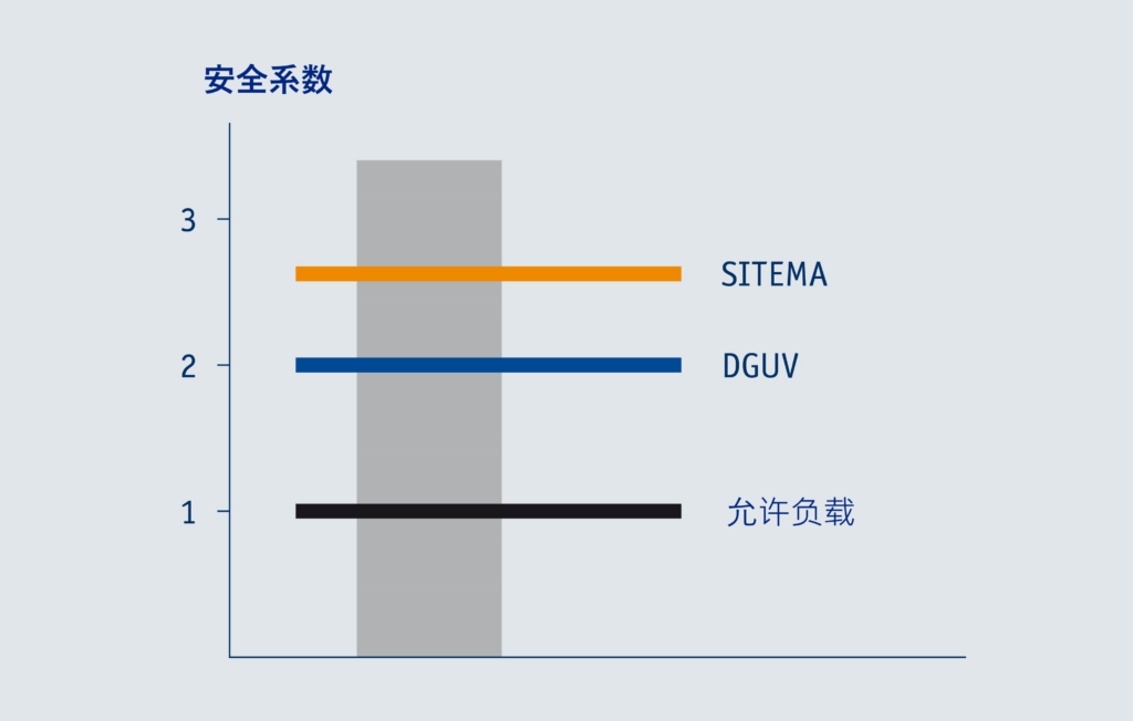 拥有许可的采用SiForce技术的SITEMA锁紧器(防坠落锁紧器和安全制动器)有其允许负载。根据德国法定工伤保险同业总会(DGUV)发放许可的要求,锁紧器需最低具备2倍系数的夹持力。换言之,锁紧器的夹持力必须足以锁定等于额定载荷2倍的作用力。