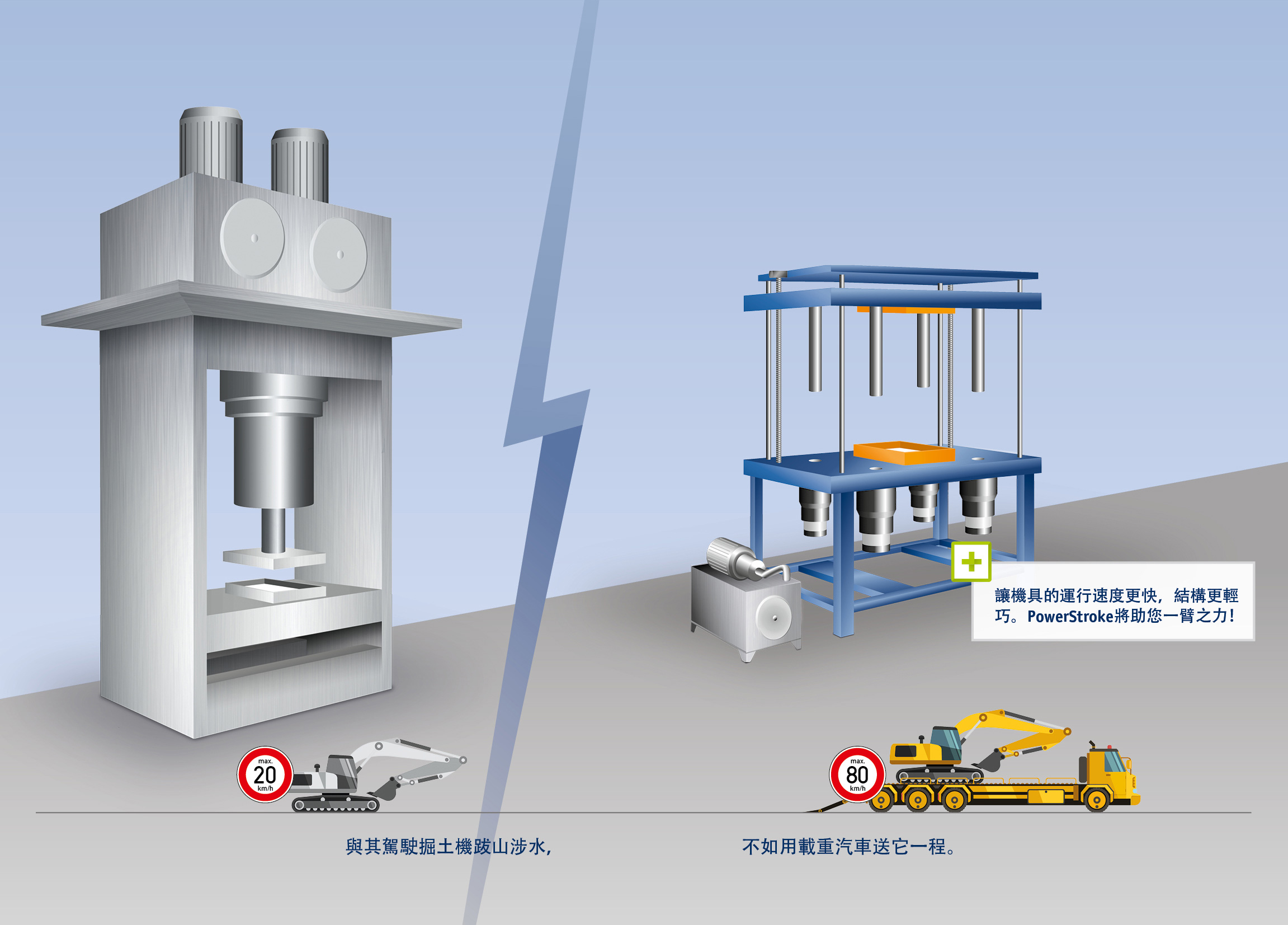 又要快速運動,又要力拔千鈞,兩者兼顧往往需要在兩方面都要妥協,效率損失不可避免。PowerStroke是個大力士,它能承擔最高可達1800千牛頓的力道。而模具的打開、閉合、定位則可選擇更節能、更輕巧、更快速而且造價相對低廉的驅動器來完成!